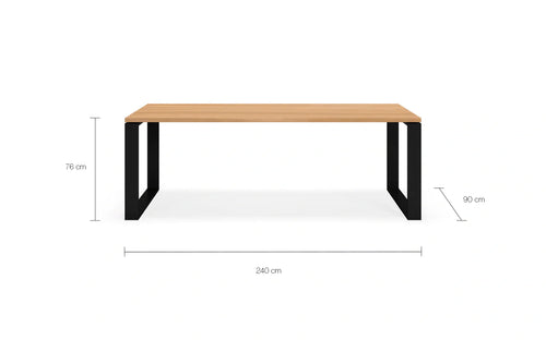 Front view of the Diana Dining Table featuring a solid oak top and black steel frame, styled with colorful ceramic vases and minimalist black dining chairs in an elegant Scandinavian interior. Front view of the Diana Dining Table featuring a solid oak top and black steel frame, styled with colorful ceramic vases and minimalist black dining chairs in an elegant Scandinavian interior.