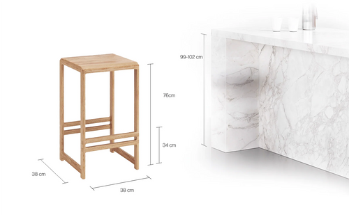 Natural oak Eva bar stools in a modern kitchen with marble countertops, showcasing minimalist design and comfort.