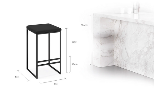 Svea black bar stools with sand leather seats at a modern kitchen island with marble countertop.