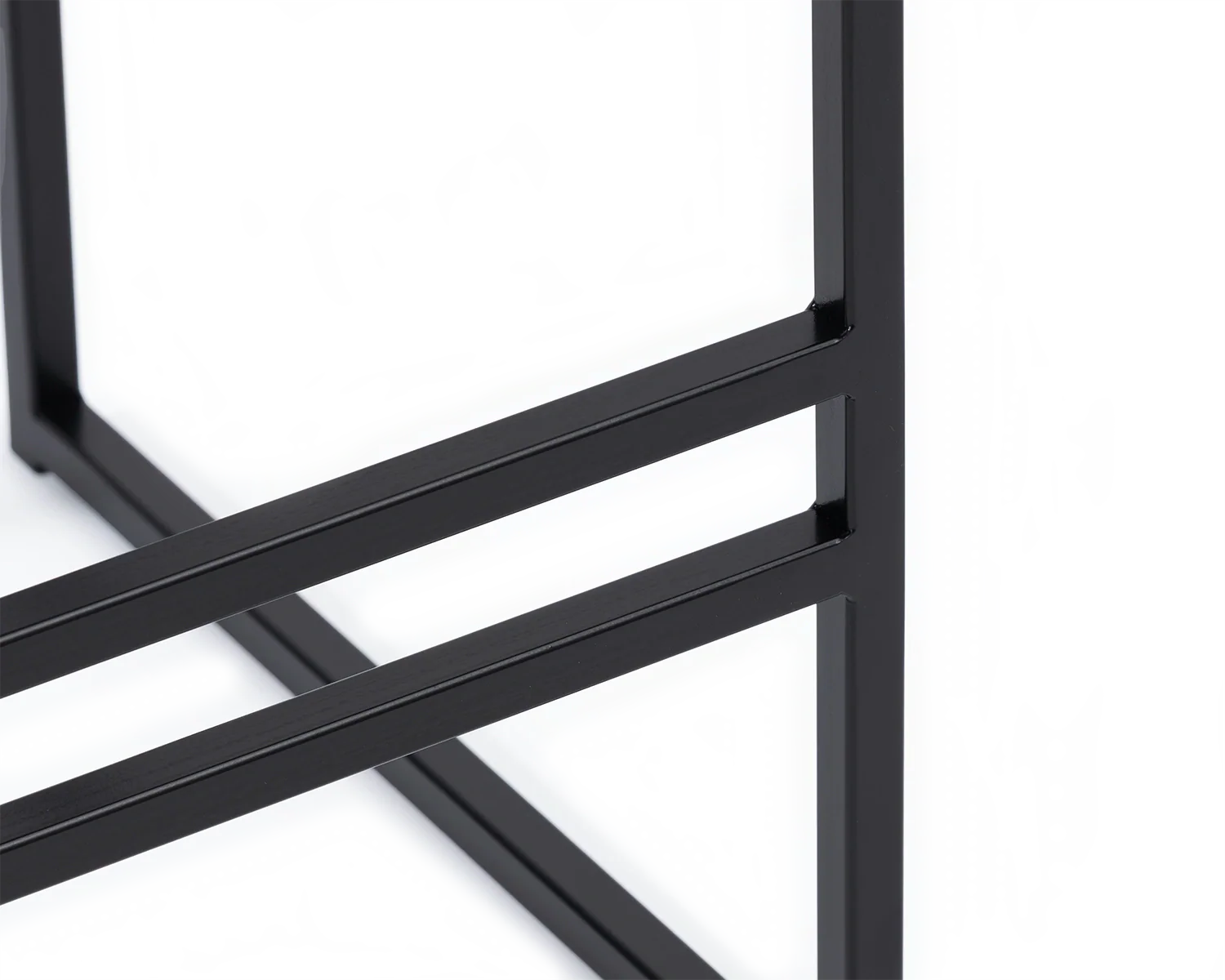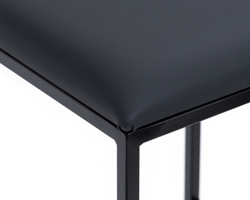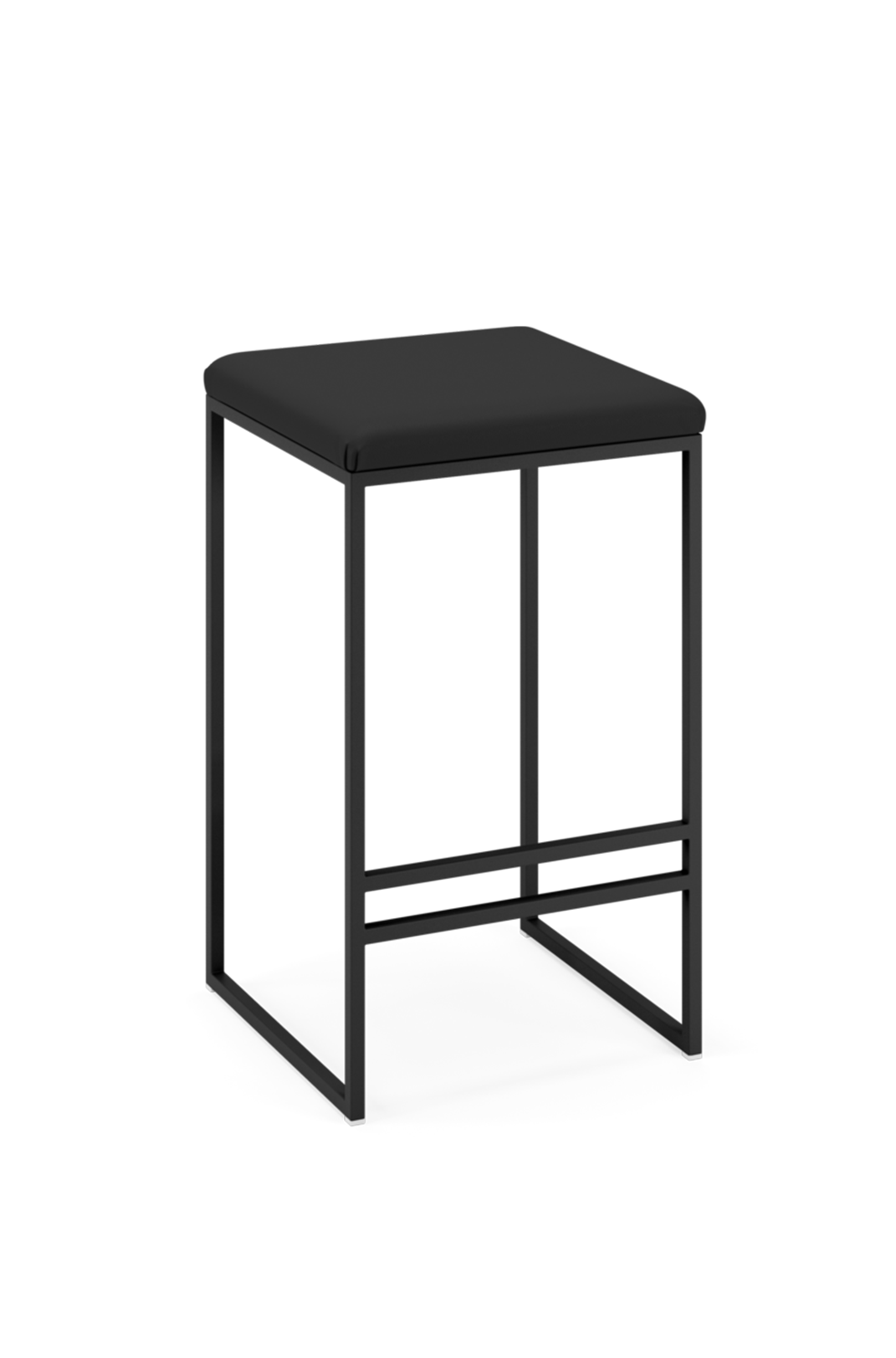 Two By Crea Svea all-black bar stools with sleek metal frames and dark seats, positioned at a white marble kitchen island, with light wooden cabinetry and a marble backsplash in the background. Ideal for modern minimalist kitchen designs and contemporary furniture. Two By Crea Svea all-black bar stools with sleek metal frames and dark seats, positioned at a white marble kitchen island, with light wooden cabinetry and a marble backsplash in the background. Ideal for modern minimalist kitchen designs and contemporary furniture.