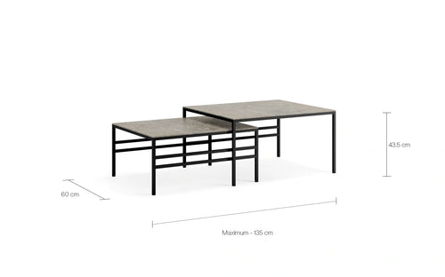 Close-up front view of the Anton Nesting Coffee Table from by Crea, featuring a minimalist black steel frame and durable Dekton top, styled with modern decor in a neutral interior. Close-up front view of the Anton Nesting Coffee Table from by Crea, featuring a minimalist black steel frame and durable Dekton top, styled with modern decor in a neutral interior.