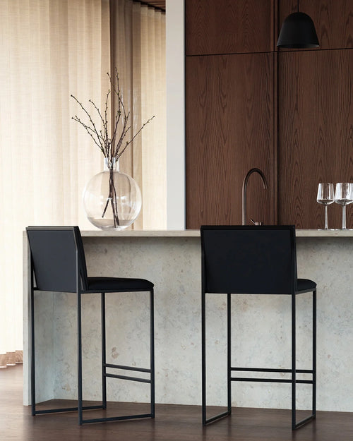 Modern Philip bar stools with black leather seats and black frames, set at a contemporary kitchen island.
