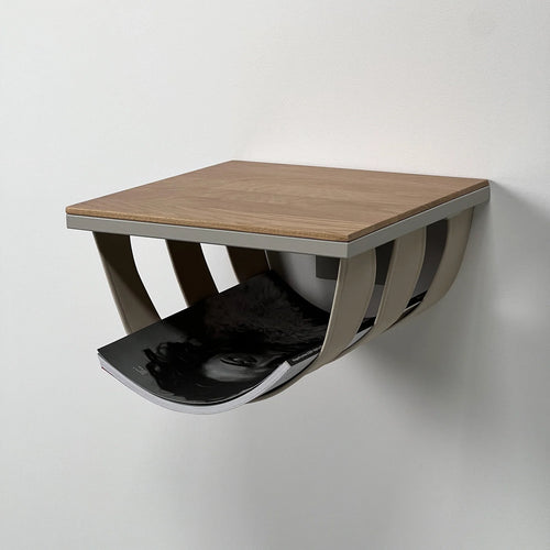 Lisa wall shelf in black frame with oak top and sand leather accents, ideal for modern interior decor and stylish storage.